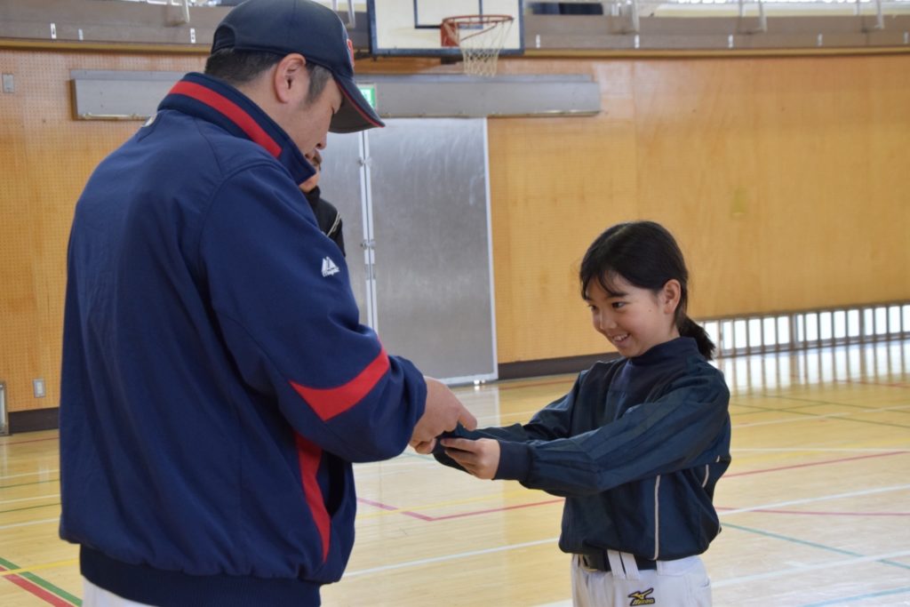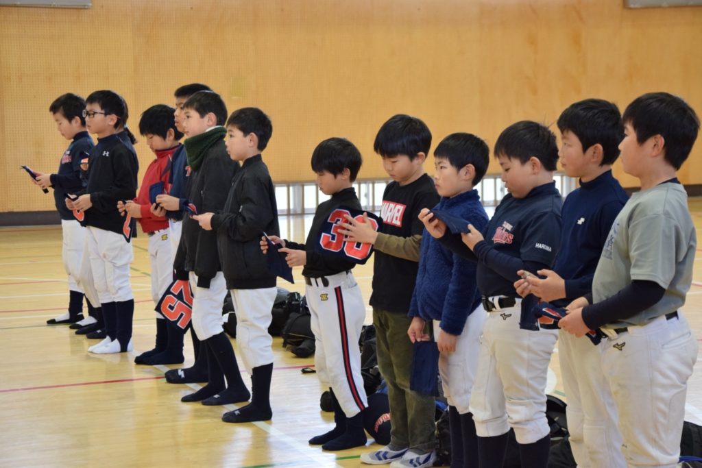 低学年の練習後には、午後の練習試合に向け、今期低学年キャプテン・背番号を発表し、監督から選手に手渡しました。